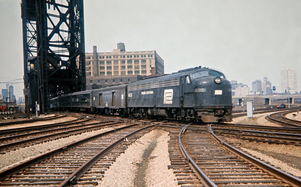 Bjorklund, John F.; Bjorklund-79-05-05.JPG; Chicago, Illinois, PC #14 leaving Union Station for Detroit, MI; 1971-04-11; Still Image; 35mm Color Slide; 35 mm; Center for Railroad Photography and Art; Bjorklund-79-05-05.JPG; © 2016, Center for Railroad Photography and Art