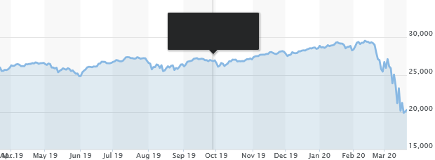 If you look to the right side of this chart you’ll see the DOW all time high at 29,511 on February 12, 2020. At the extreme right edge you’ll see it today (3/20) close to its 52 week low at about 20,000. Close to 30% off the market top. You’ve got to figure its going to go lower. In 2008 with the Global Financial Crisis it went negative 48% off the top. I suppose if I cared I’d put 3% of available cash in the market now.