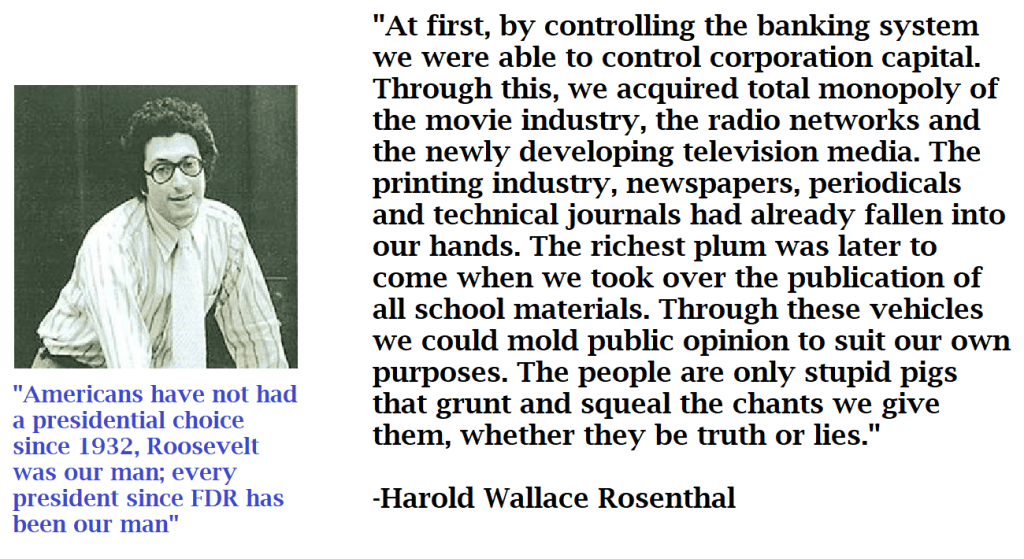 “We Jews have put issue upon issue to the American people. Then we promote both sides of the issue as confusion reigns. With their eye’s fixed on the issues, they fail to see who is behind every scene. We Jews toy with the American public as a cat toys with a mouse.”
