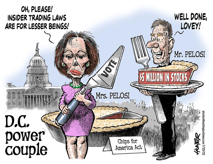 This came out a couple of weeks ago. Days before a vote to subsidize U.S. chip makers, Pelosi has hubby buy chip stocks. Before anyone else knew what was coming. Insider trading. Corrupt as hell. And I really doubt if ‘norm’ news covered it. Just makes you sick. There’s nothing you can do about. Congress isn’t going to ban themselves from profiting from insider trading. Congress isn’t going to impose term limits on itself.