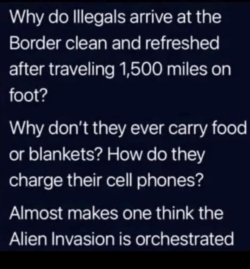 Why do illegals arrive at the border clean and refreshed after traveling 1,500 miles on foot? Why don’t they ever carry food or blankets? How do they charge their cell phones? Almost makes one think the alien invasion is orchestrated.