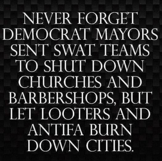 Never forget Democrat Mayors sent SWAT Teams to shut down churches and barbershops, but let looters and Antifa burn down cities.