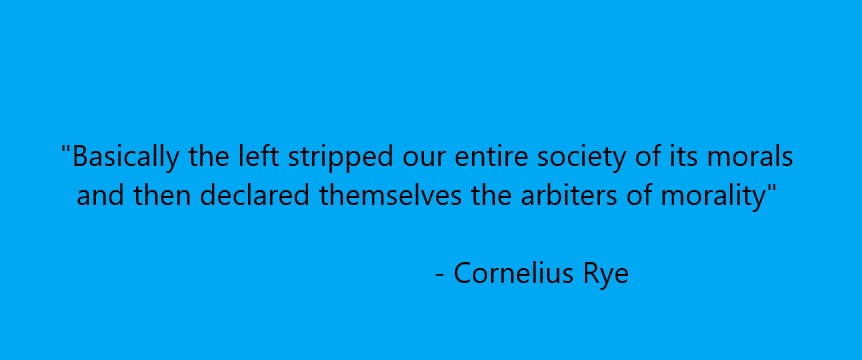 Cornelius Rye is a guy on Gab. The name is suspiciously like it is from a character in literature or something. But whatever the case his quote is so rich with layers. They (commies) destroyed the old value system, and through force inserted a new one into our lives. Using just one example, look how the homosexual lobby moved from “we just want to be left alone”, to you are cancelled unless you not just accept but embrace their radical agenda. Now that they accomplished that they’ve moved into their bullshit transgender and pedophilia crap.