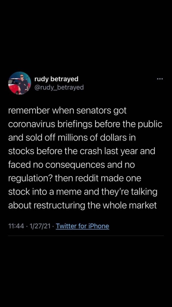 The millennial’s aren’t stupid. They have been the ‘gamer‘ generation. Its not by accident that GameStop was their first target. That’s what they do. As Stacy explains in that video, their world was games. They’ve been figuring out games since they were 5. They know this is all a game and that they have the ability to bring down Goliath. They have the tech savvy, they have the numbers, they have the anger.