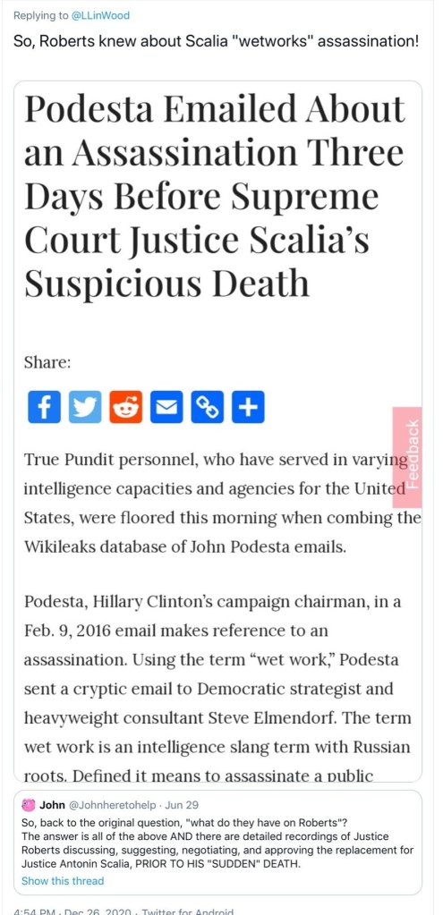 “So, Roberts knew about Scalia “wetworks” assassination! There are detailed recordings of Justice Roberts discussing, suggesting, negotiating, and approving the replacement for Justice Antonin Scalia, PRIOR TO HIS “SUDDEN” DEATH.’ ” – I just remember there was something about the pillow.