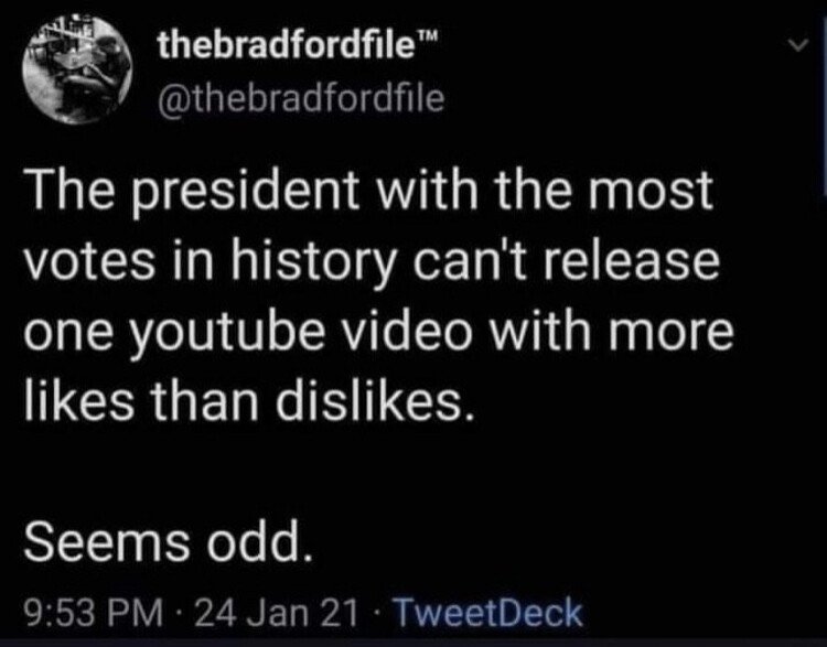 It always comes down to “follow the money”. Another fundamental that recently collapsed was freedom of speech. When former president Trump was kicked off of Facebook, YouTube and Twitter, that opened some eyes. You couple that with every video released on Biden gets way more Thumbs Down then Thumbs Up, you know he didn’t win. Which brings me to the two nuggets below that I found on Gab: